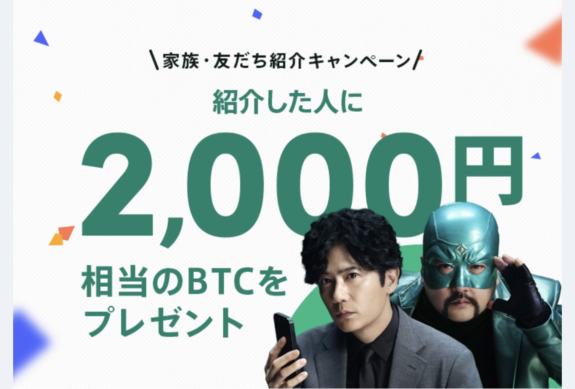 友だちや家族に紹介すれば、さらに2,000円分のビットコインがもらえるし、相手も1,500円分のビットコインがもらえるよ♪