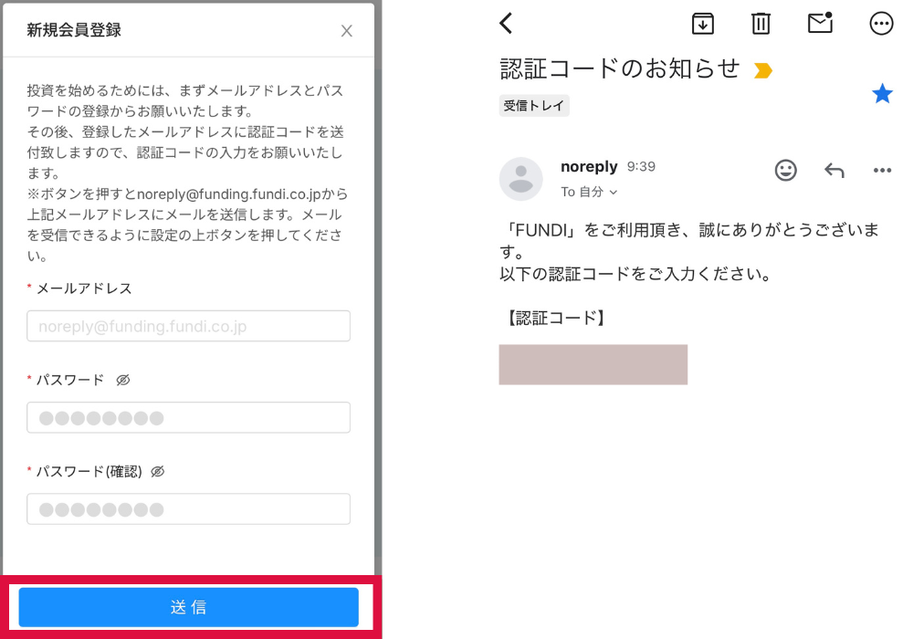 登録したメールアドレスに「認証コード」が送られてくるので、確認してね。