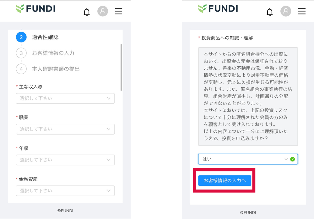 「会員適合性確認」と「投資商品への知識・理解」の両方に「はい」を入力したら、「お客様情報の入力へ」をタップしよう。