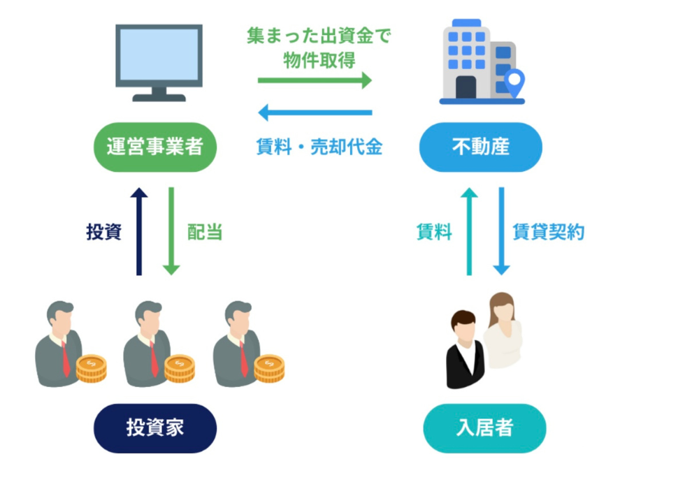 多くの投資家から集めた出資金をもとに、運営会社が物件を取得・運用し、