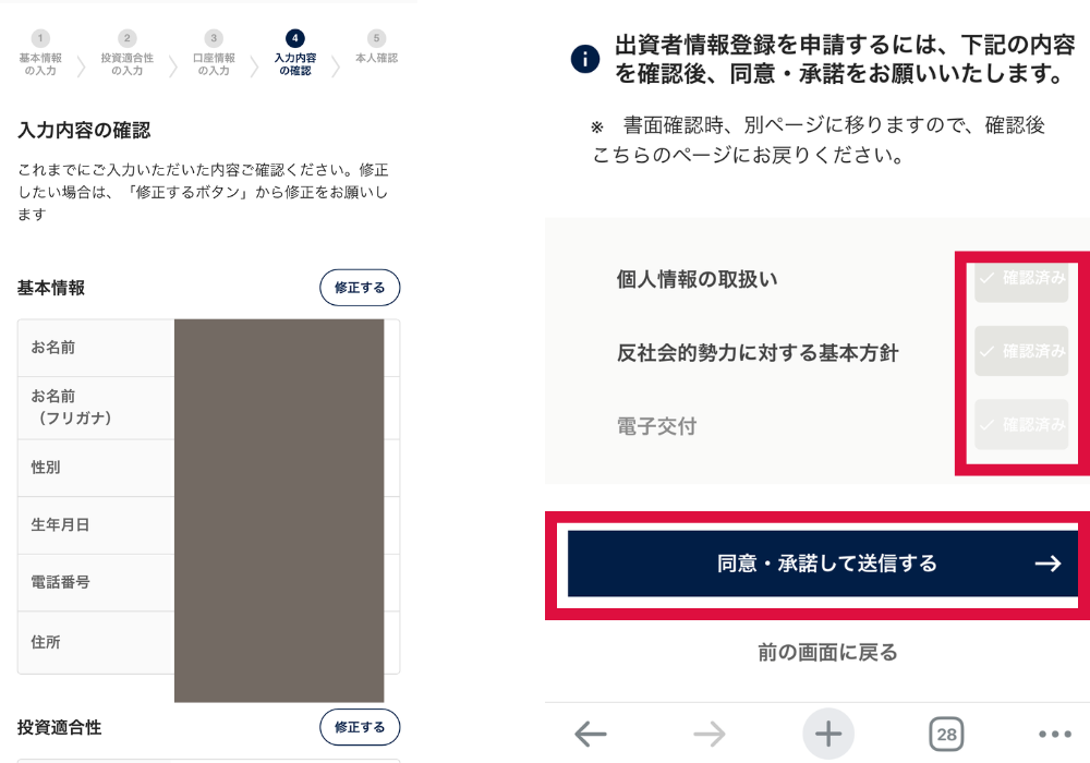 すべて入力し終わったら、内容を確認して「同意・承諾して送信する」をタップしてね。