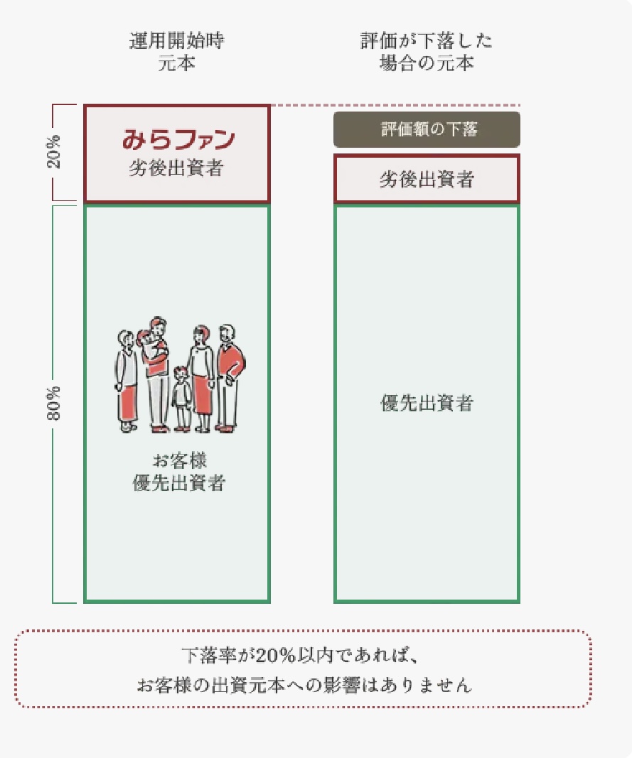 みらファンでは「優先劣後(ゆうせんれつご)システム」を採用していて、もし不動産の価値が下がって損が出ても、最大20%までなら「みらファン」が身代わりに負担してくれる🛡️