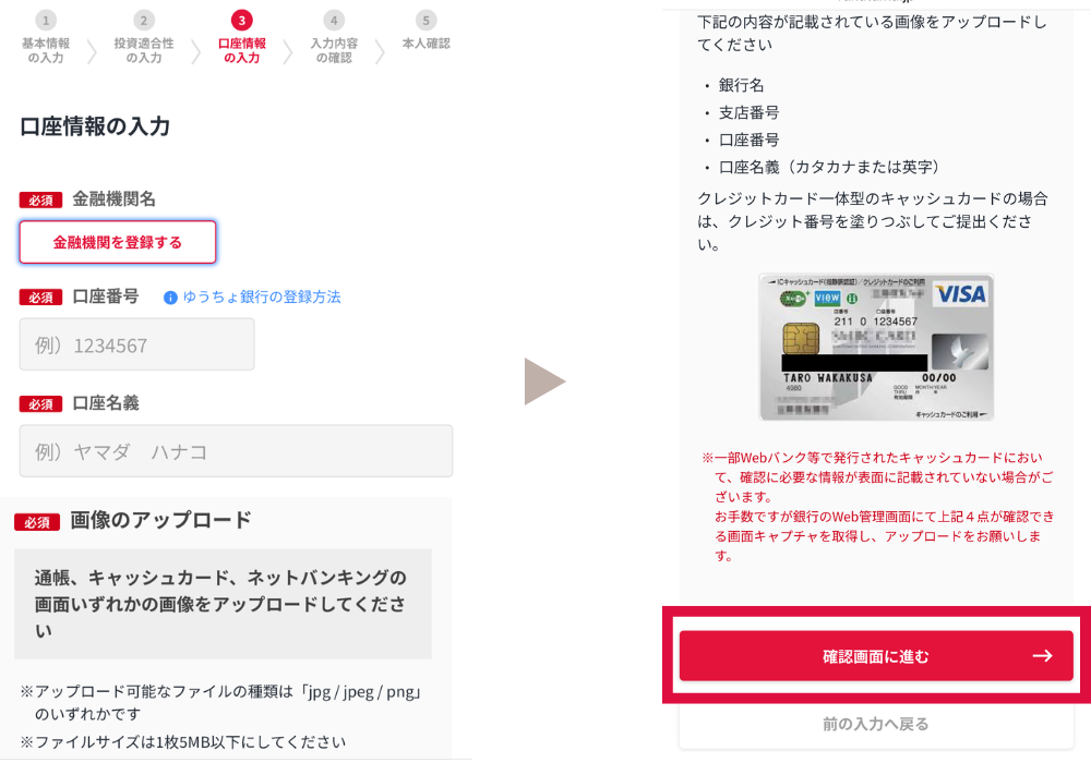 画面に従って、名前、住所、生年月日などの基本情報を入力していくよ。次に、金融資産の状況や投資経験について聞かれるから、正直に答えてね♪