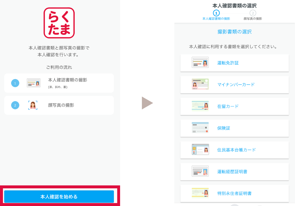 提出する本人確認書類(運転免許証、マイナンバーカードなど)を選び、指示に従って書類の写真や、自分の顔写真をスマホで撮るだけ。
