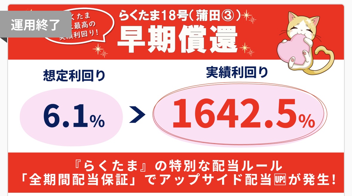 上記のアップサイド配当の仕組みがあるから、らくたまでは過去に、たった1日で運用が終了し、実質利回り1642.5%になったファンドもあった!