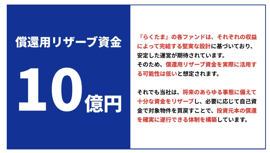万が一に備えて、「償還用リザーブ資金」として、運用資金の25%相当を常に確保。必要があれば即座に返還できるように準備されてるよ。