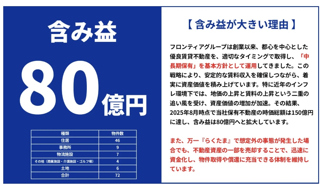 らくたまを運営するフロンティアグループは、本業での含み益がなんと80億円もある!