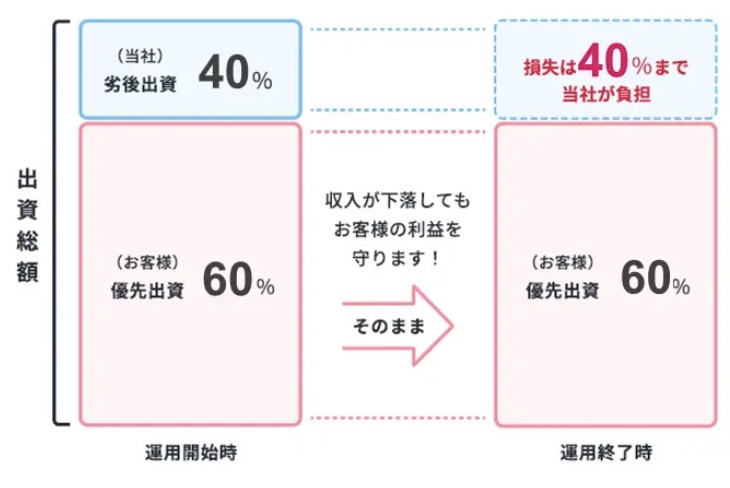 例えば、私たちがファンドに60%出資したら、運営会社が残り40%を劣後出資(後順位出資)として負担するの。万が一物件運用で損失が出たときは、この会社の出したお金から優先的に損失を被るルールになってるよ。