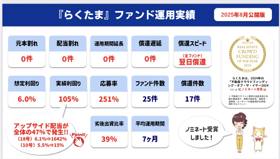 らくたまは、今までに元本割れ、償還遅延が0と実績もあり、安全対策もピカイチの会社だよ♪