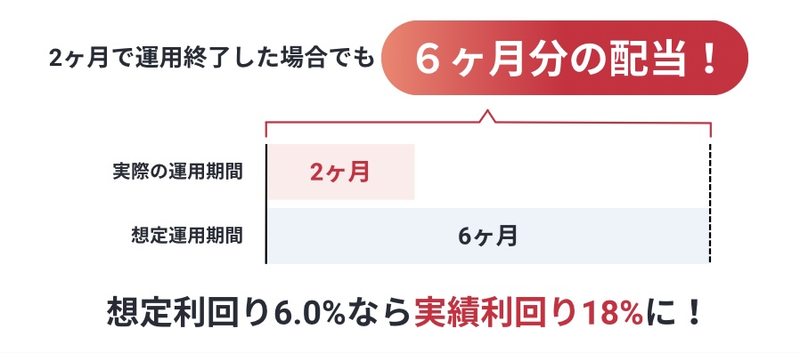 もし6ヶ月運用の予定が2ヶ月で終了した場合でも、6ヶ月分の利息を受け取れるから、実質的な年利は18%に跳ね上がる!「短く終わったら損」じゃなくて「むしろ得になる」仕組みは、とっても嬉しいよね😍