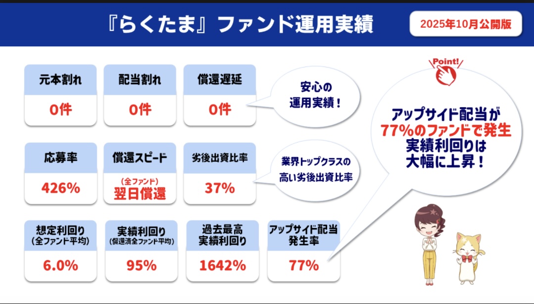 らくたまは、今までに元本割れ、償還遅延が0と実績もあり、安全対策もピカイチの会社だよ♪