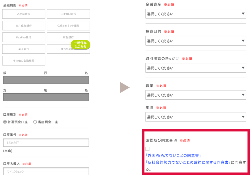 名前や住所、出金先の銀行口座、投資に関する情報などを入力し、確認事項に同意するをチェックする。