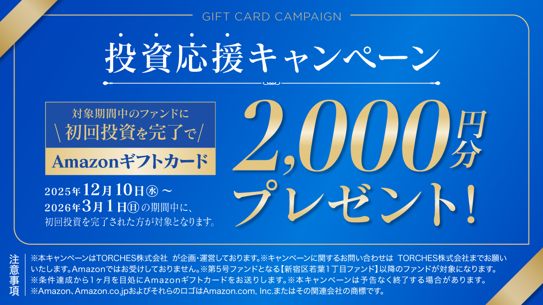 トーチーズでは、今なら初めて投資した人全員アマギフがもらえる案件が😍